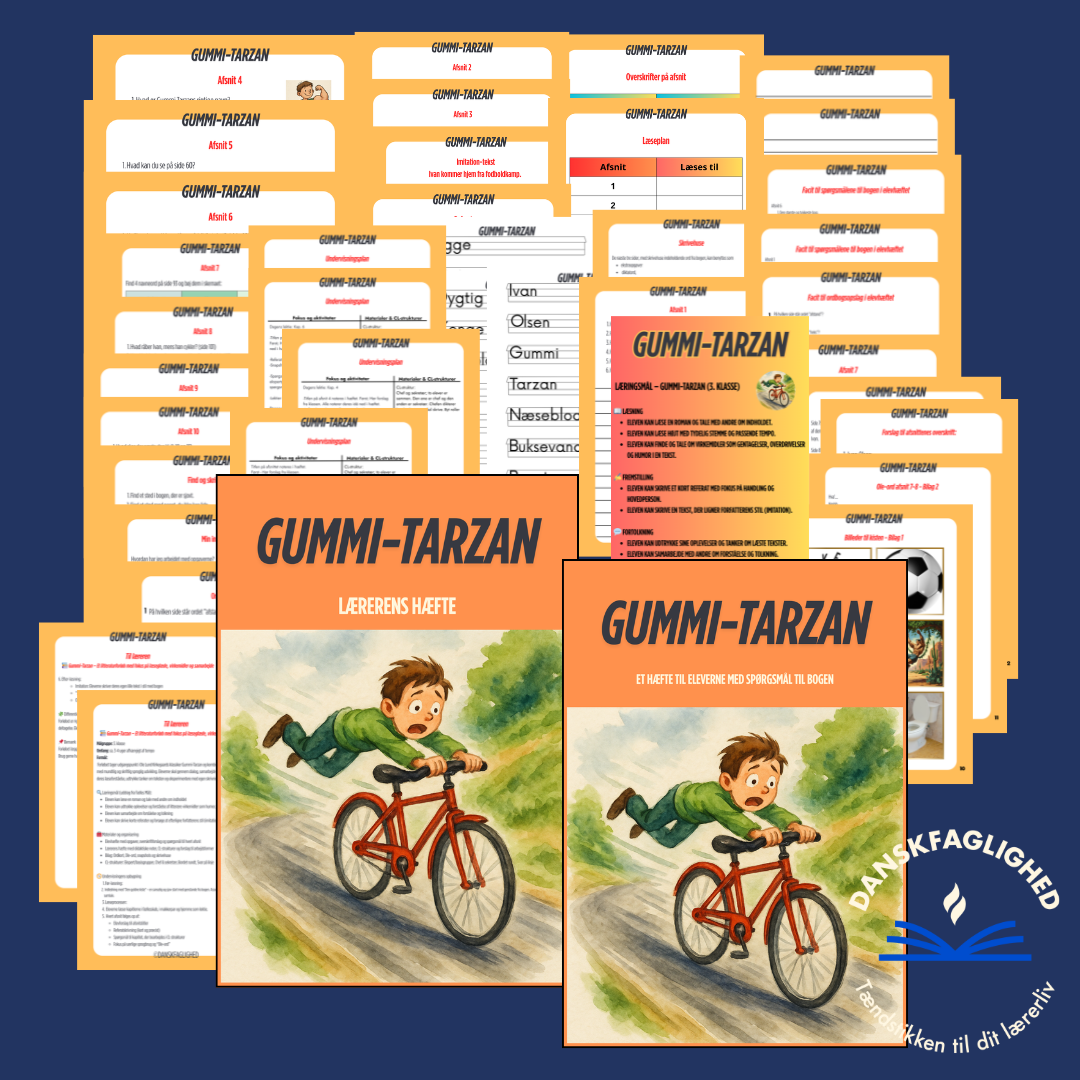 Forløbet tager udgangspunkt i Ole Lund Kirkegaards klassiker Gummi-Tarzan og kombinerer litteraturoplevelse med mundtlig og skriftlig sproglig udvikling. Eleverne skal gennem dialog, samarbejde og opgaveløsning styrke deres læseforståelse, udtrykke tanker om teksten og eksperimentere med egen skrivning inspireret af bogen.